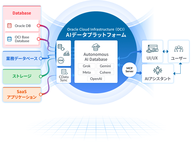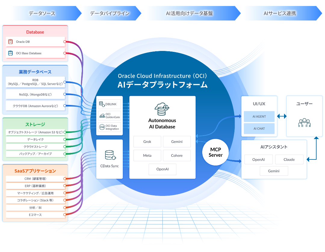 OCI標準コネクタと CData Sync の活用により、SaaS・クラウド・オンプレ環境の多様なデータソースからの連携を実現。国内SaaS (kintone、Sansan、freeeなど)にも対応し、散在する業務データを横断的に集約・統合。